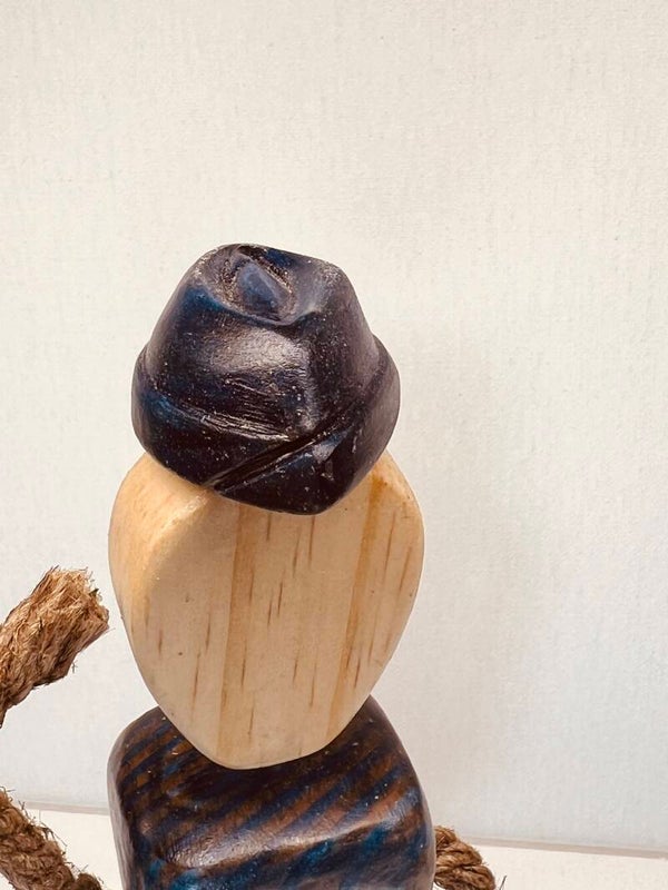 Item Details: This wooden figurine is 10 inches tall and 3 inches wide. It's crafted from solid wood and carved by hand. The figurine has a light stain on its base and a smooth protective coat.