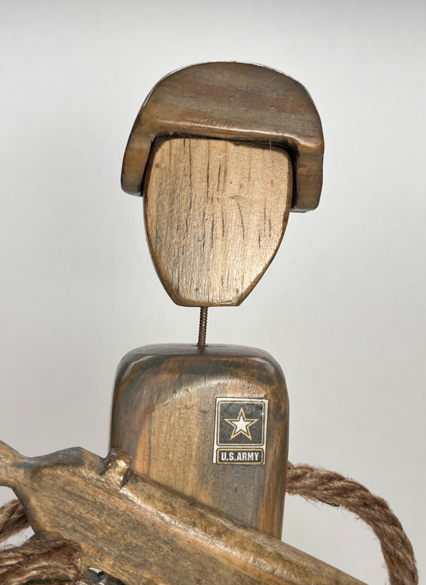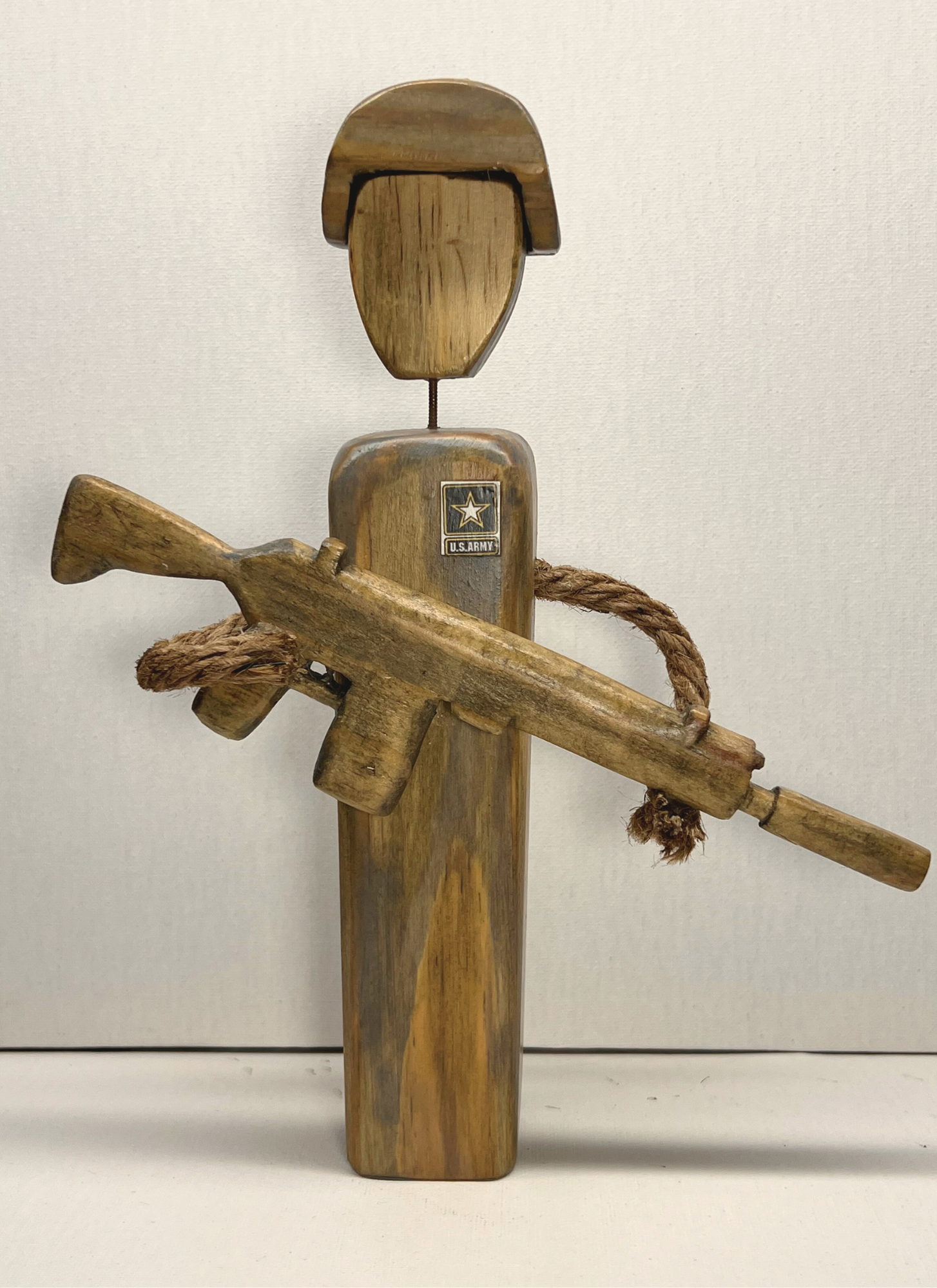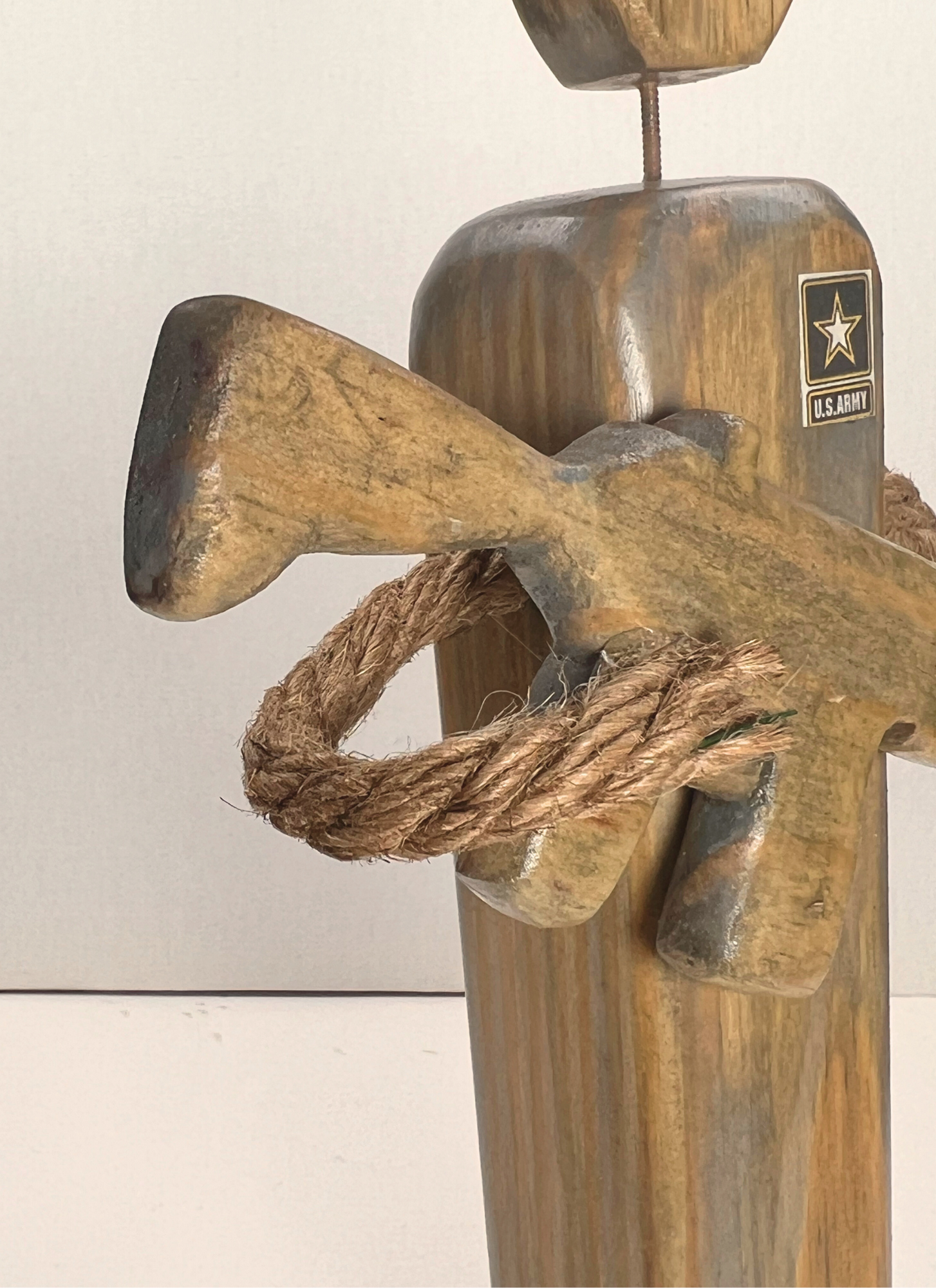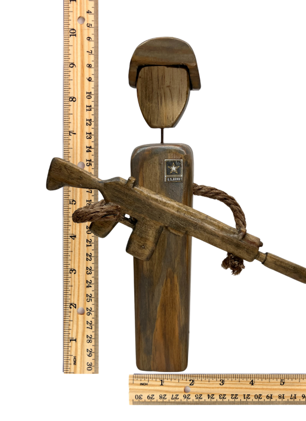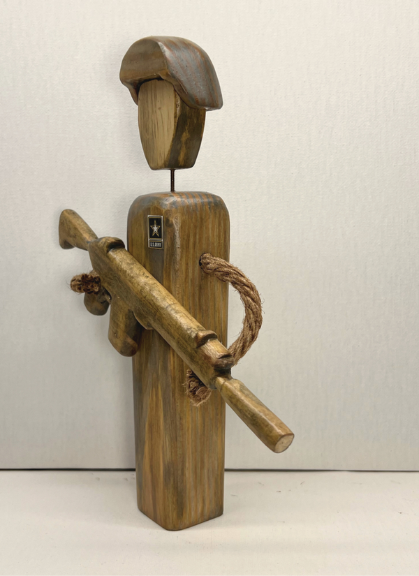A U.S Army soldier wood Sculpture. A work of art crafted with precision and skill from a solid piece of wood. The rifle and helmet is carefully hand carved bringing forth a three-dimensional representation of a subject. The wood has a smooth polyacrylic coat and the stain adds to the tactile appeal of the figurine. The natural grain of the wood may be intentionally incorporated into the design, enhancing the overall aesthetic.