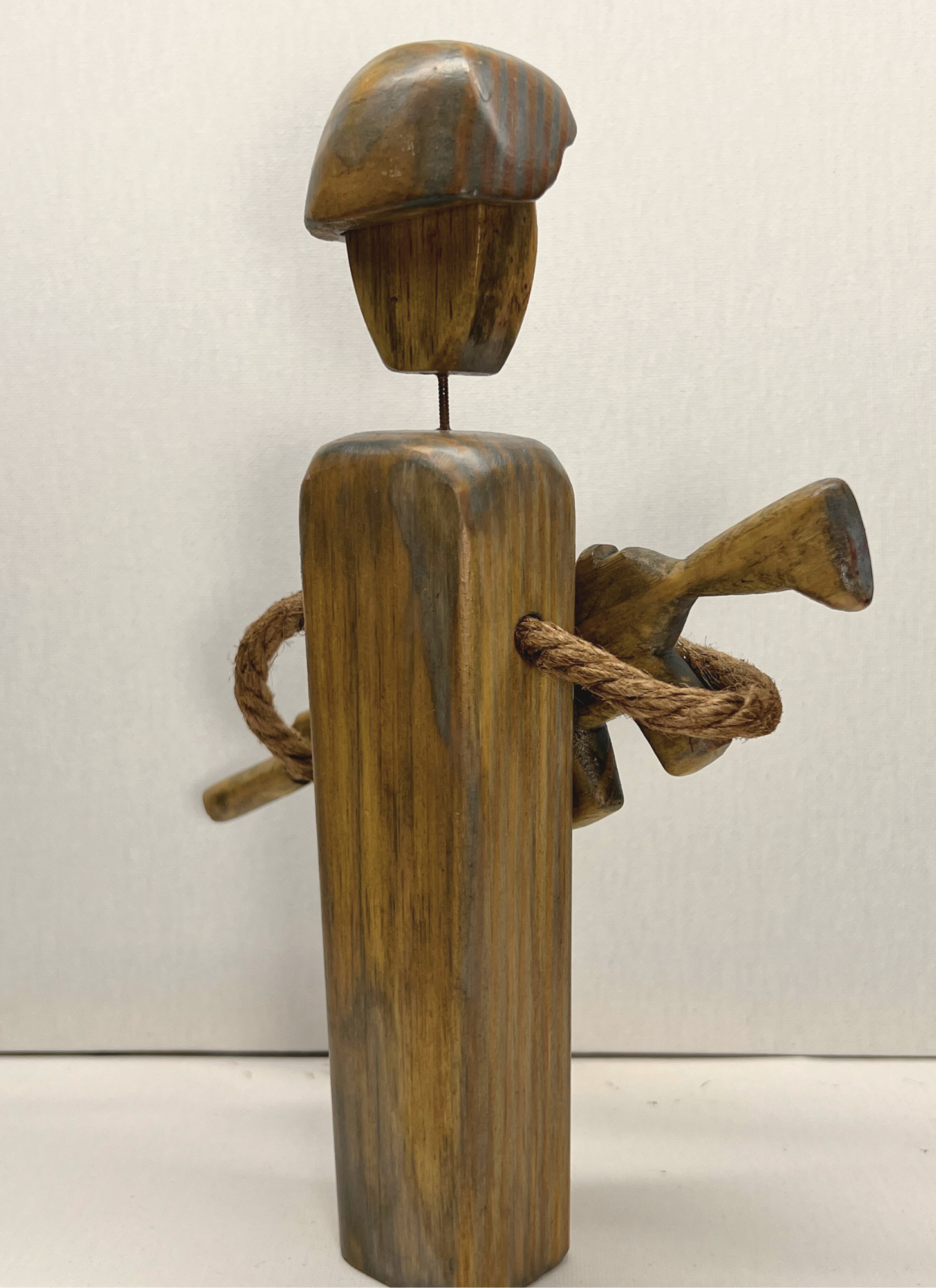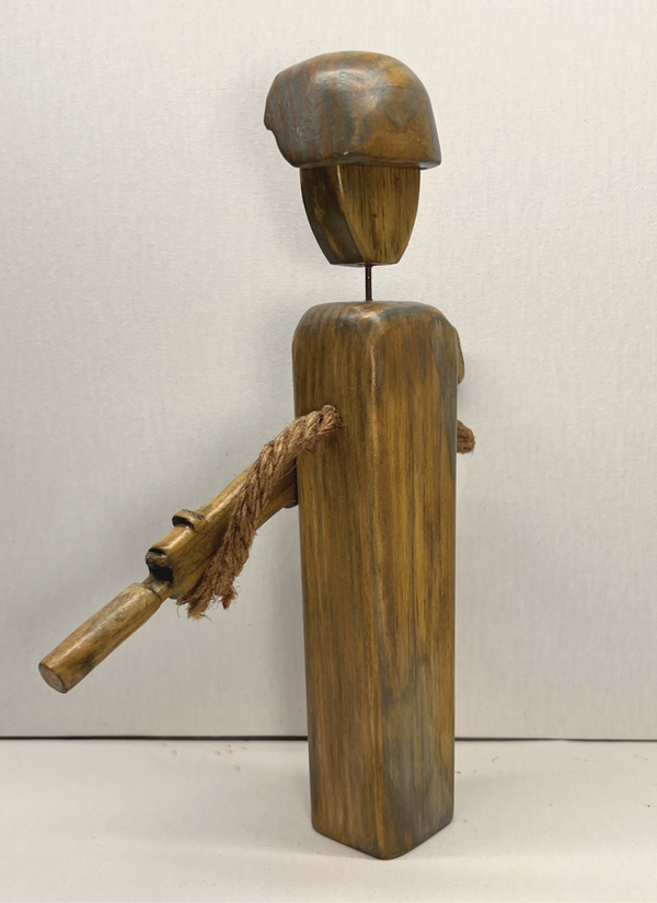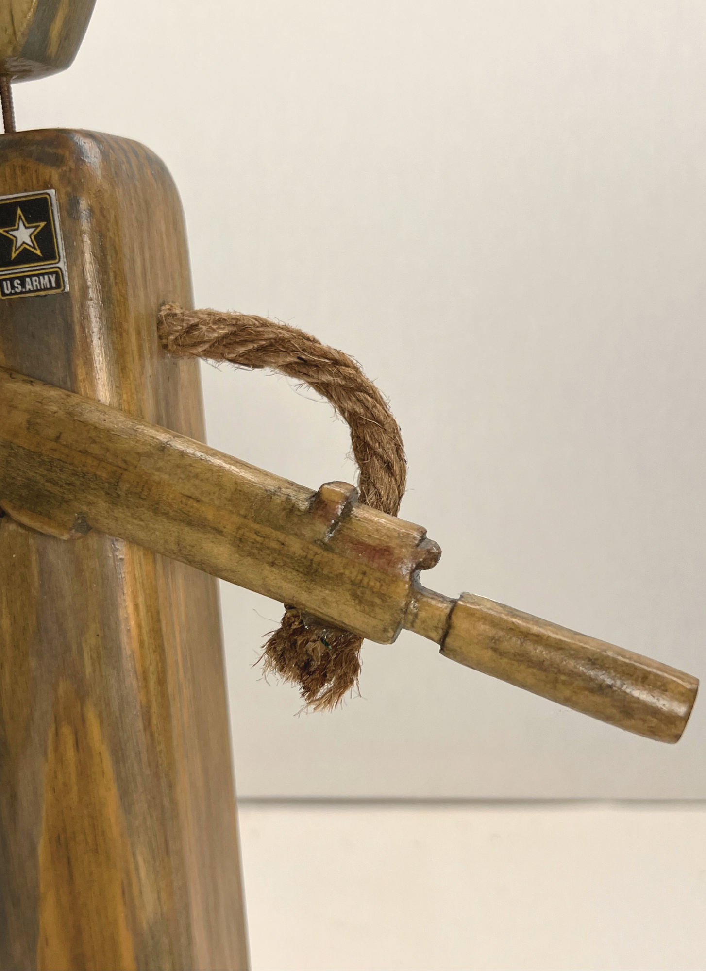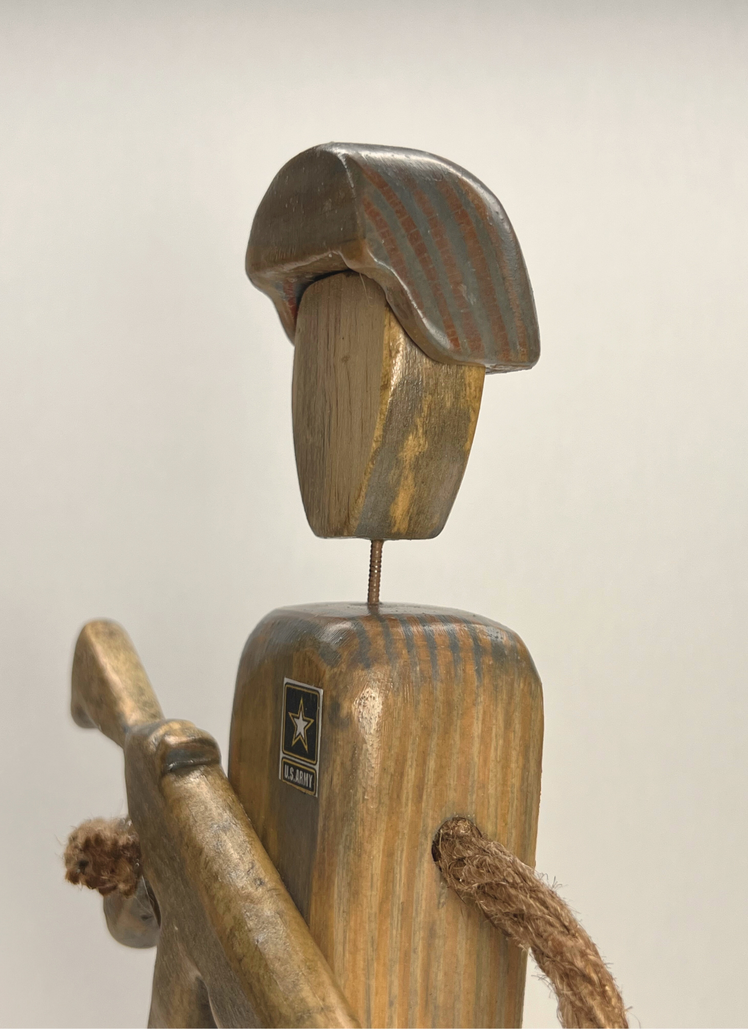 A U.S Army soldier wood Sculpture. A work of art crafted with precision and skill from a solid piece of wood. The rifle and helmet is carefully hand carved bringing forth a three-dimensional representation of a subject. The wood has a smooth polyacrylic coat and the stain adds to the tactile appeal of the figurine. The natural grain of the wood may be intentionally incorporated into the design, enhancing the overall aesthetic.