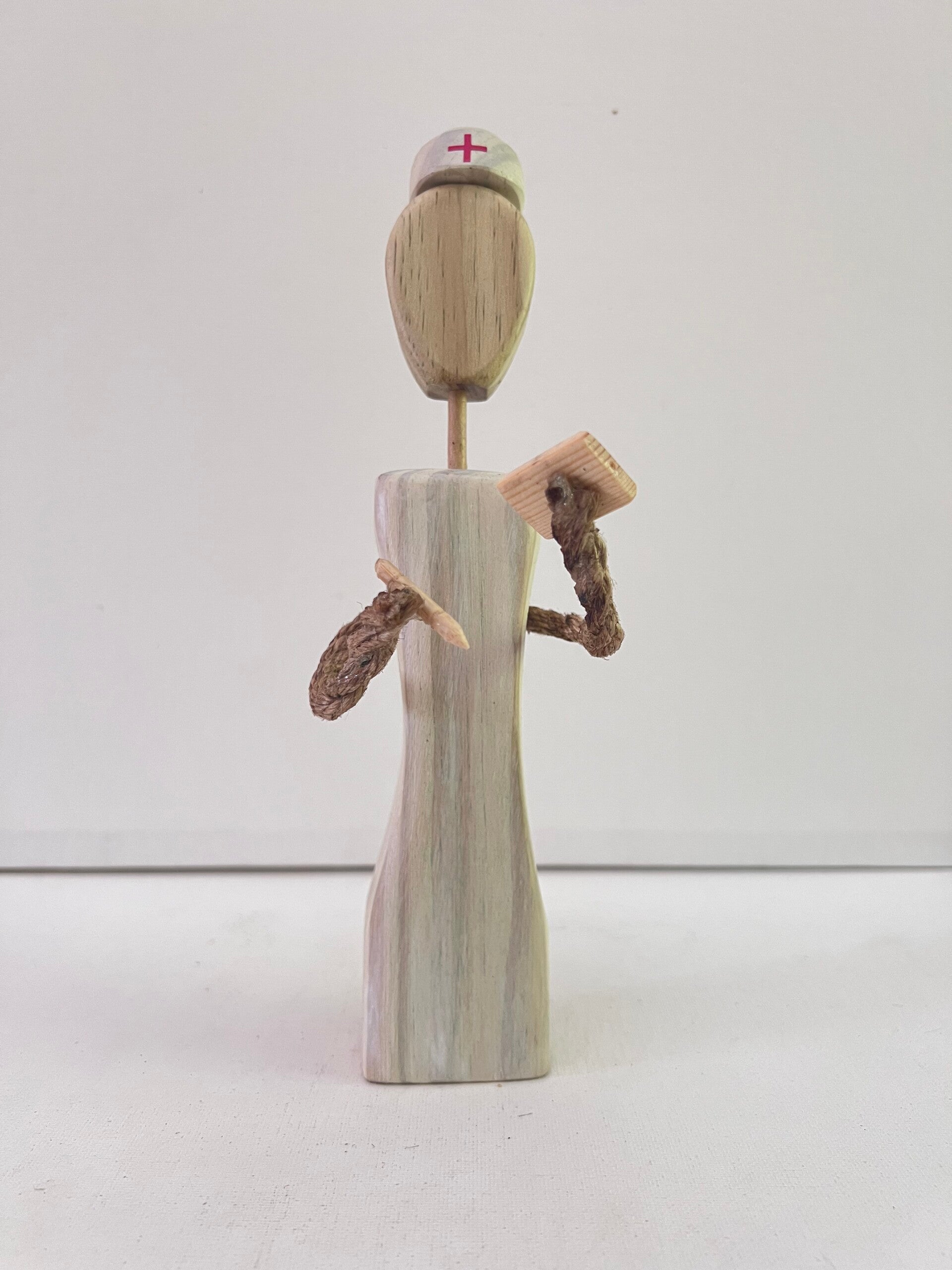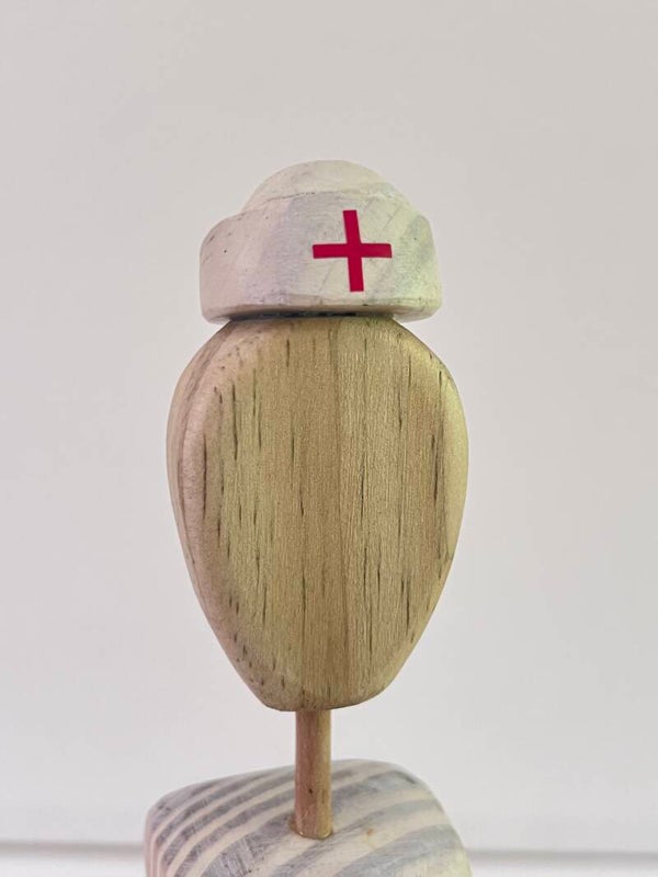 Hand-carved details, including a nurse's cap with a red cross symbol, symbolizing care and professionalism.