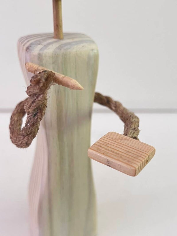 Twine arms for a touch of whimsy, holding miniature wooden tools