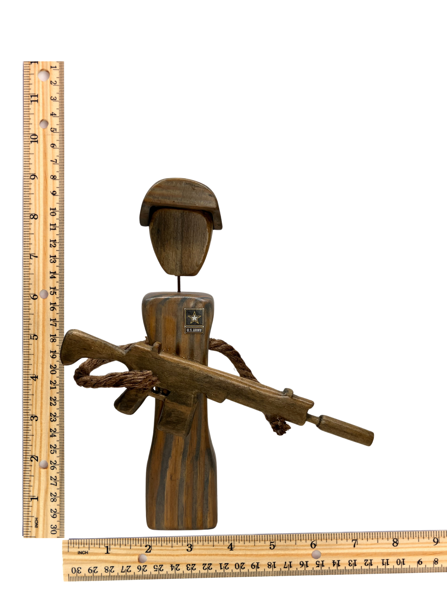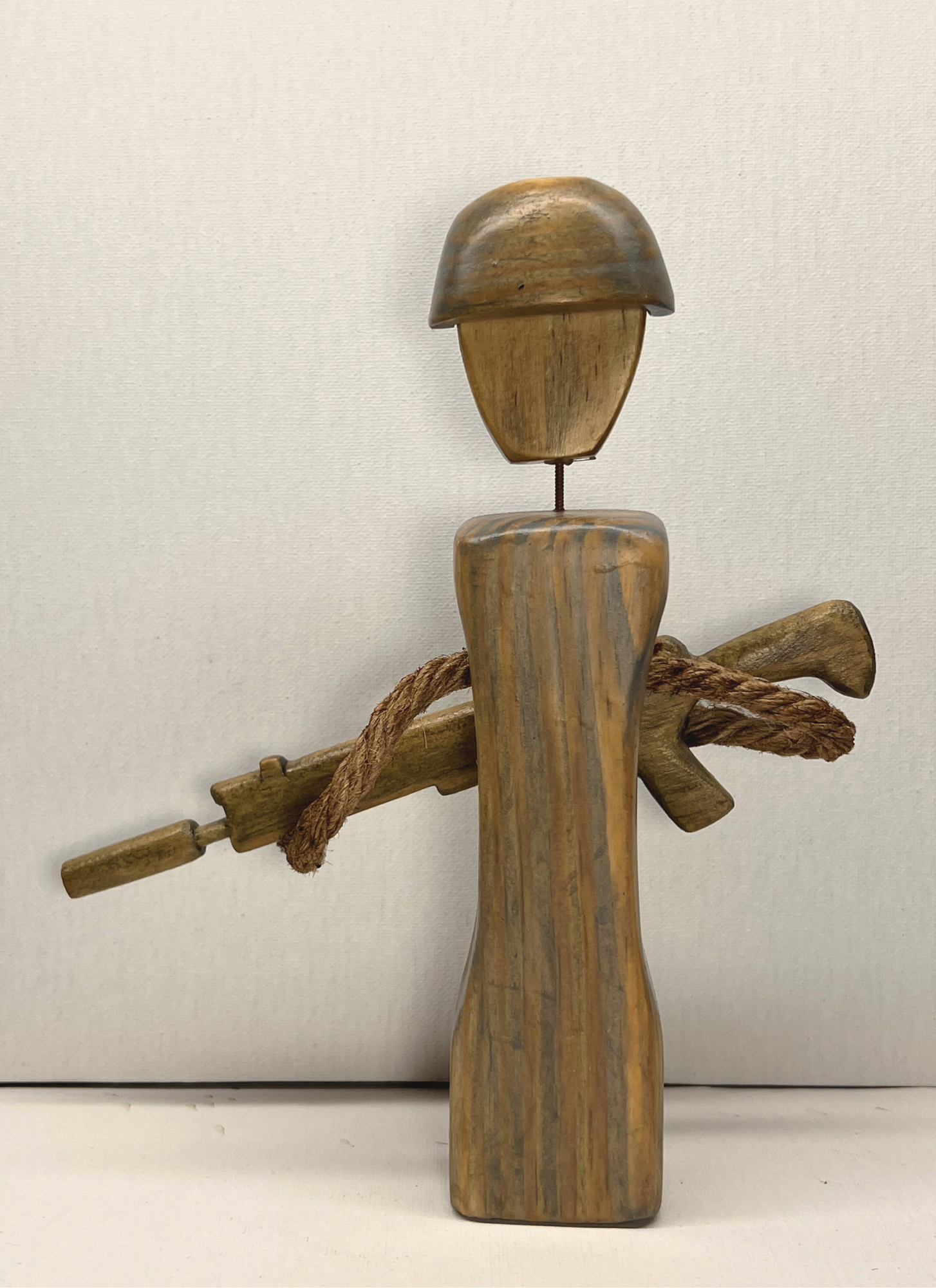 The wooden sculpture of a soldier in the army is a captivating and meticulously crafted piece of art that pays tribute to the strength, resilience, and courage of women in the armed forces. Standing tall and proud, the sculpture captures the essence of a determined and empowered soldier in a moment of readiness and vigilance. This figurine measures 9 inches in height. The helmet and rifle are both carefully carved with fine details, showcasing a special blend of stain to achieve a camouflage appearance, complemented by a delicate finish.