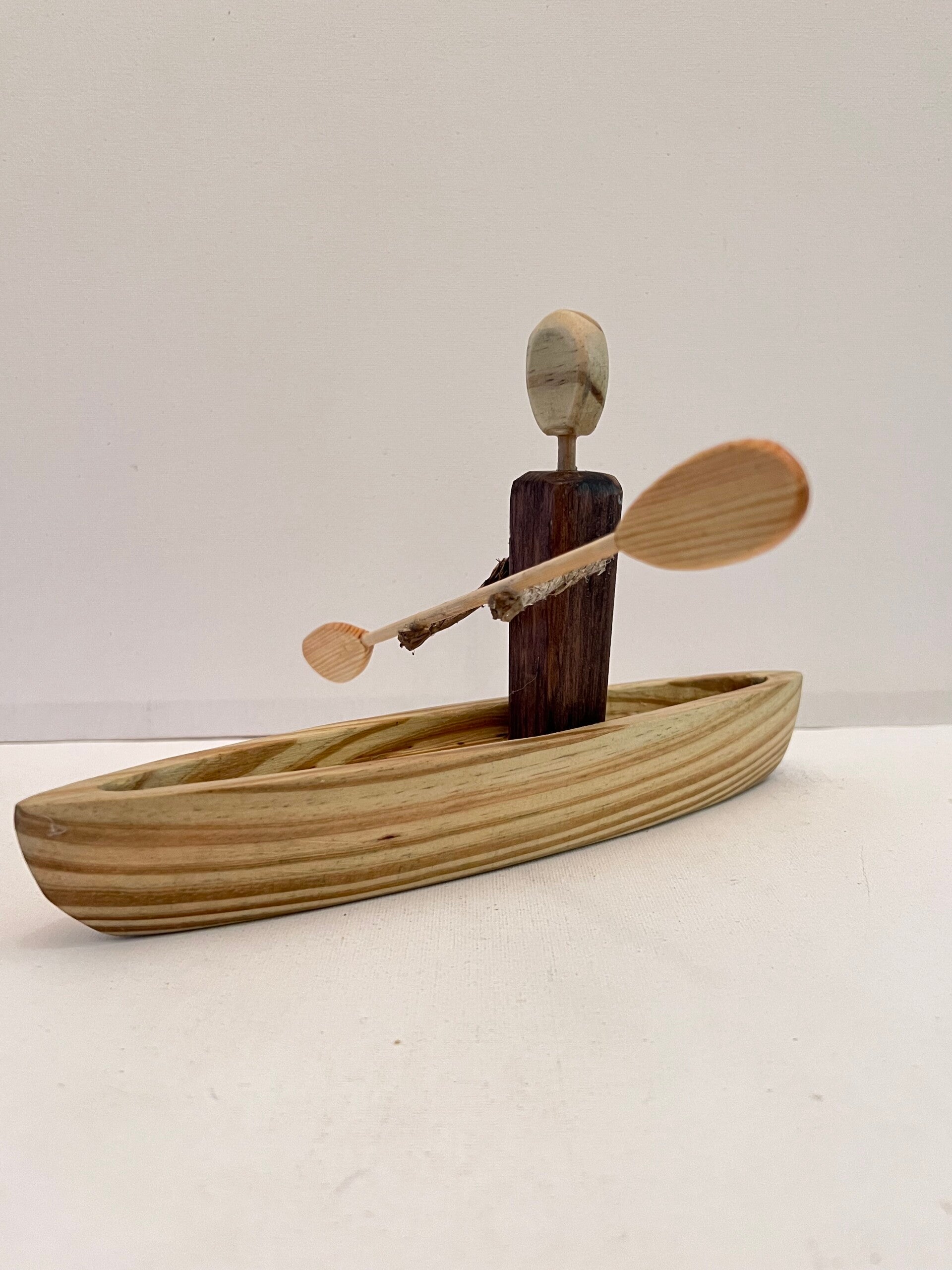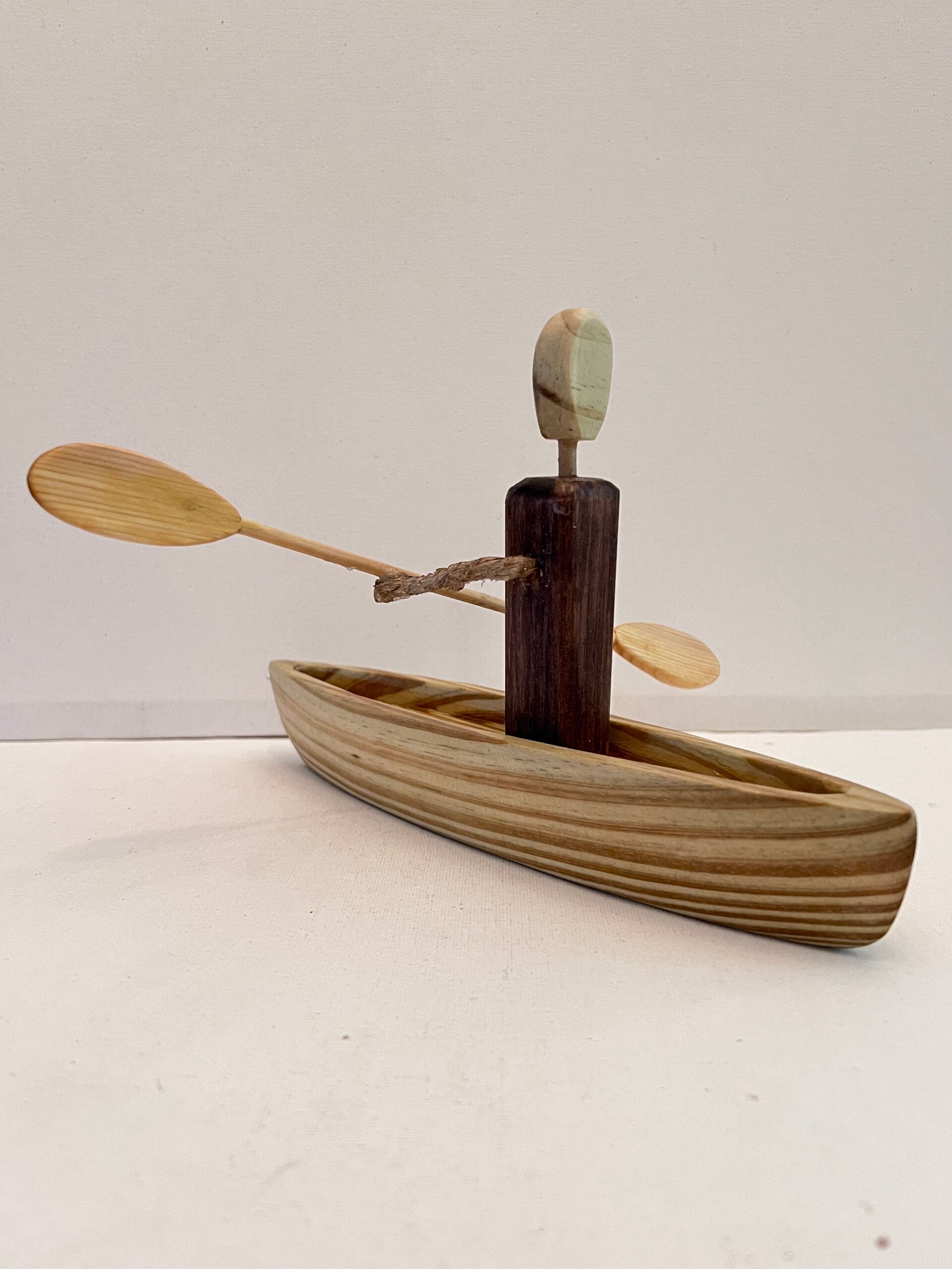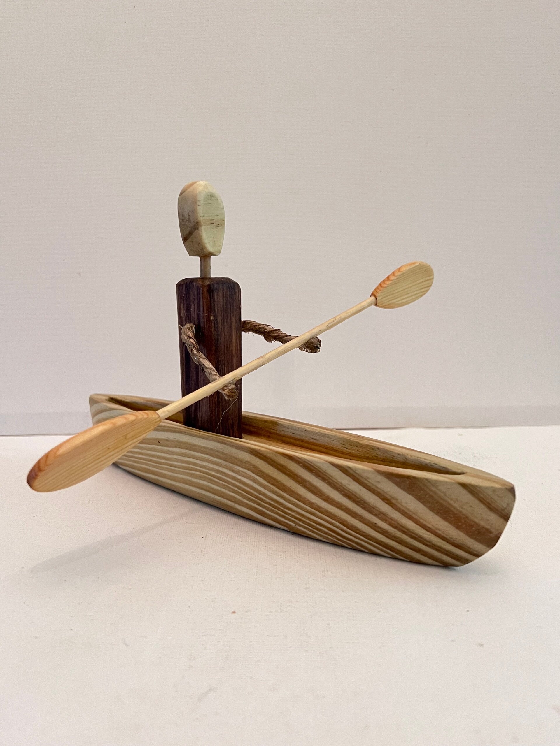 Explore the appeal of this charming handcrafted faceless wood figurine, ideal for kayaking enthusiasts or collectors of unique, artisanal decor. This remarkable piece embodies the blend of adventure and calm that kayaking represents, highlighting the natural beauty of wood craftsmanship. The figurine measures 10 inches in kayak length and 9 inches in oar length, featuring a stained finish with a polyacrylic coating.